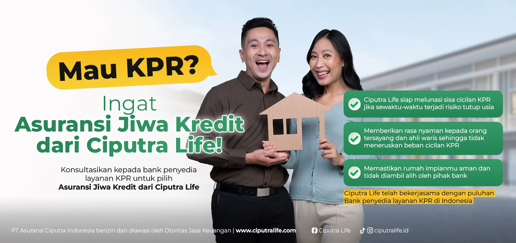 Jika Anda ingin memastikan rumah impian tetap aman dan terlindungi, lengkapi pengajuan KPR Anda dengan Asuransi Jiwa Kredit dari Ciputra Life.